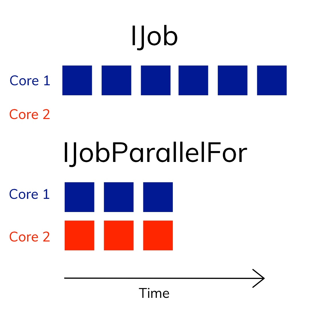 The two basic types of jobs are IJob and IJobParallelFor. IJob represents a job that is executed in a single core. IJobParallelFor distributes the elements it operates on in all the working threads. So if we have 6 elements and two cores, Unity will run 3 elemens in one core and the remaining 3 in other core.